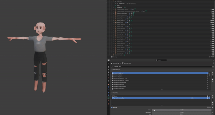 Shape key setup for body shape variation (shown in Blender)