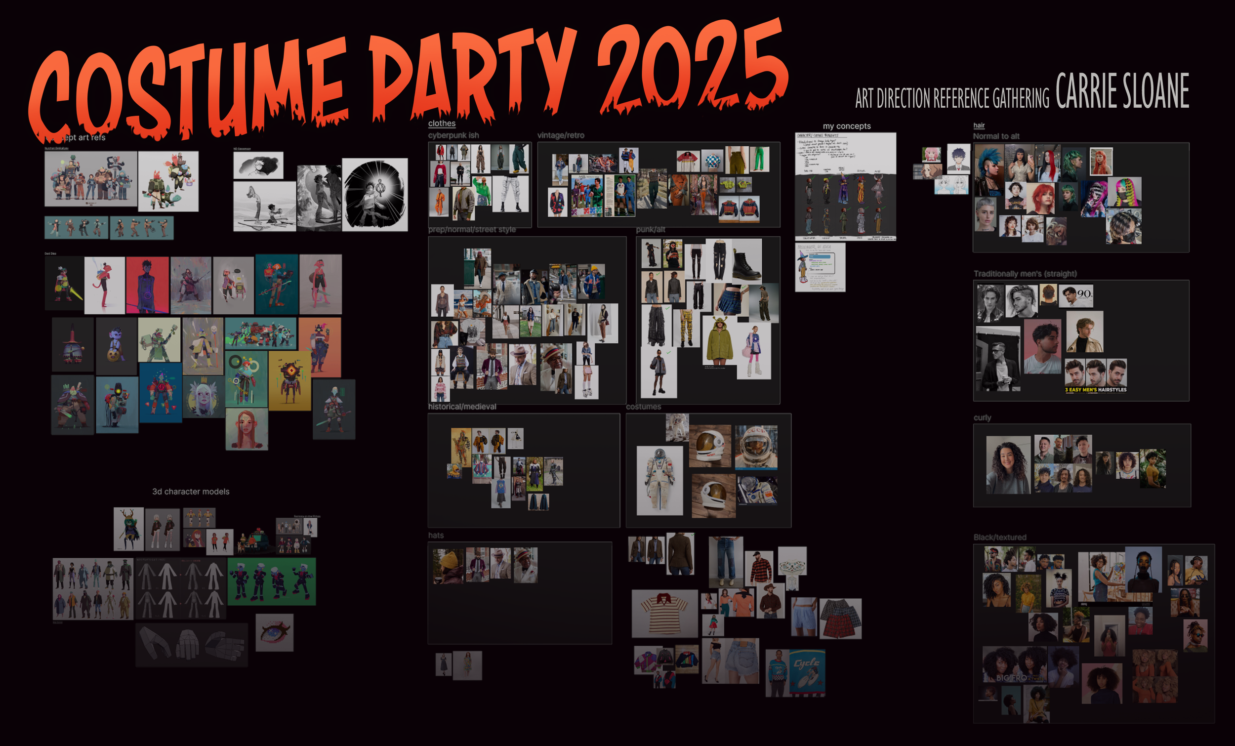 This workflow and art direction relies heavily on shape language and blocks of color, so I focused on creating fun, distinctive silhouettes. I was inspired by more illustrative and anime-influenced art styles by artists like ND Stevenson, Drew Shields, and Dani Diez, as you can see in my reference board image below. I did a lot of research and reference-gathering for all their outfits and hair, which I then created concepts for and made into 3D.