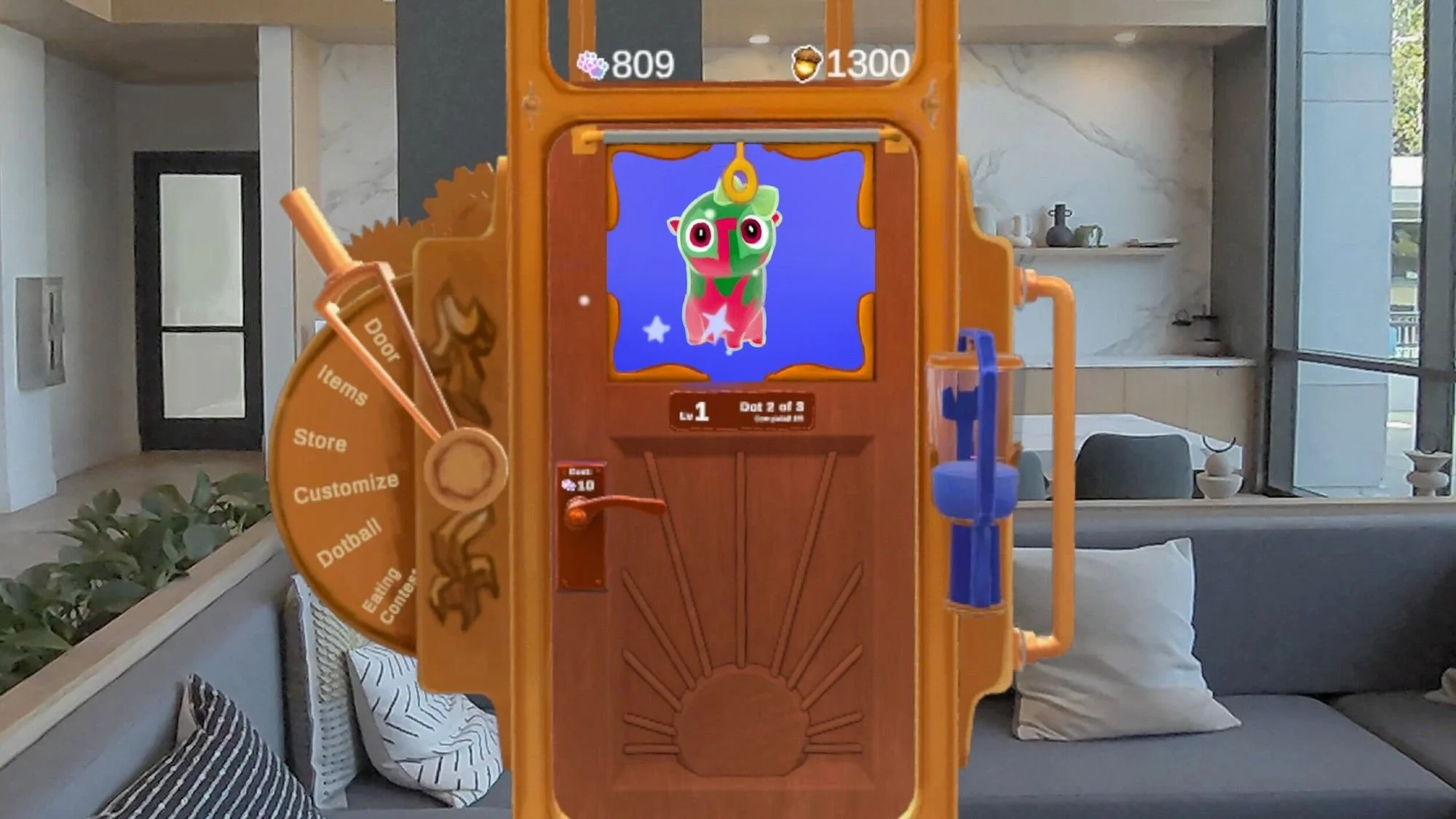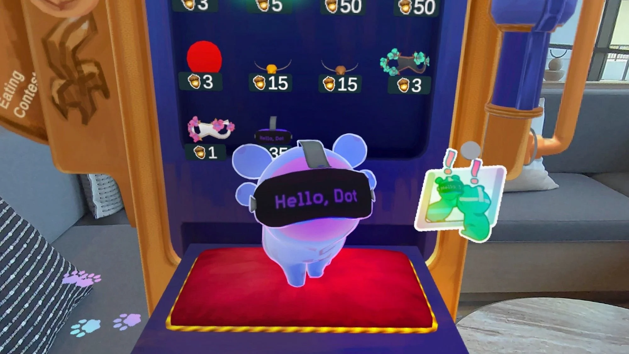 Dot trying on a VR headset cosmetic (also concepted and made by me).